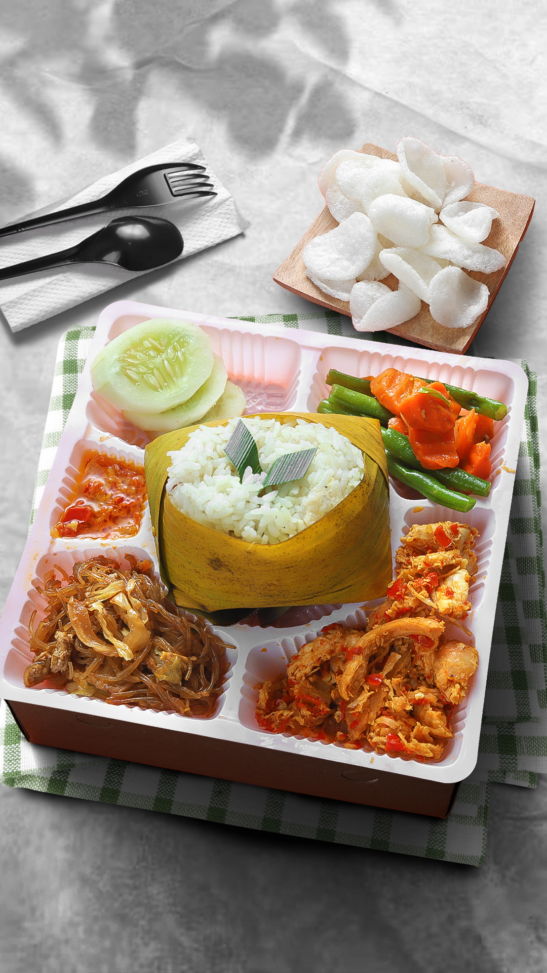 Nasi putih, ayam suwir bumbu bali, cakalang pesmol, orek tempe, tumis buncis wortel, bihun goreng, sambal terasi, kerupuk
