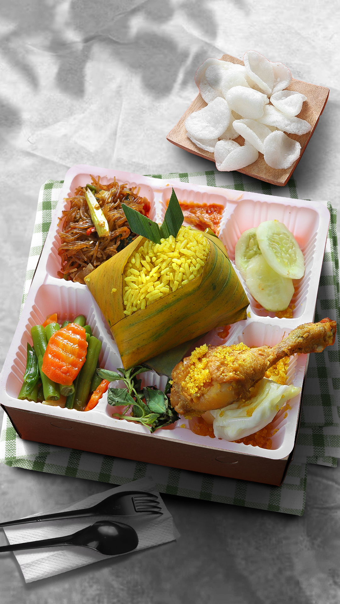 Nasl kuning, ayam goreng kremes, timun, tumis buncis wortel bihun goreng sambal terasi, kerupuk