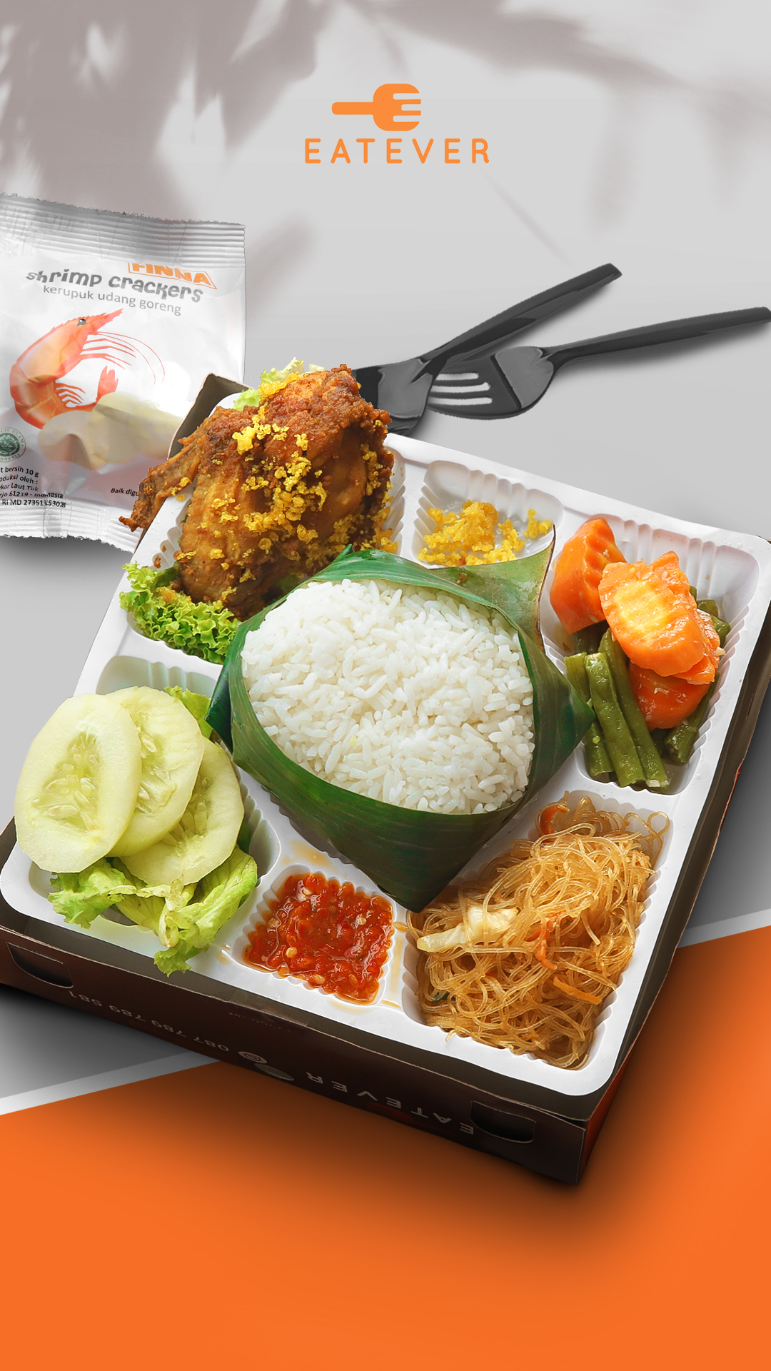 Nasi putih, ayam goreng kremes, timun, tumis buncis wortel, bihun goreng sambal terasi, kerupuk